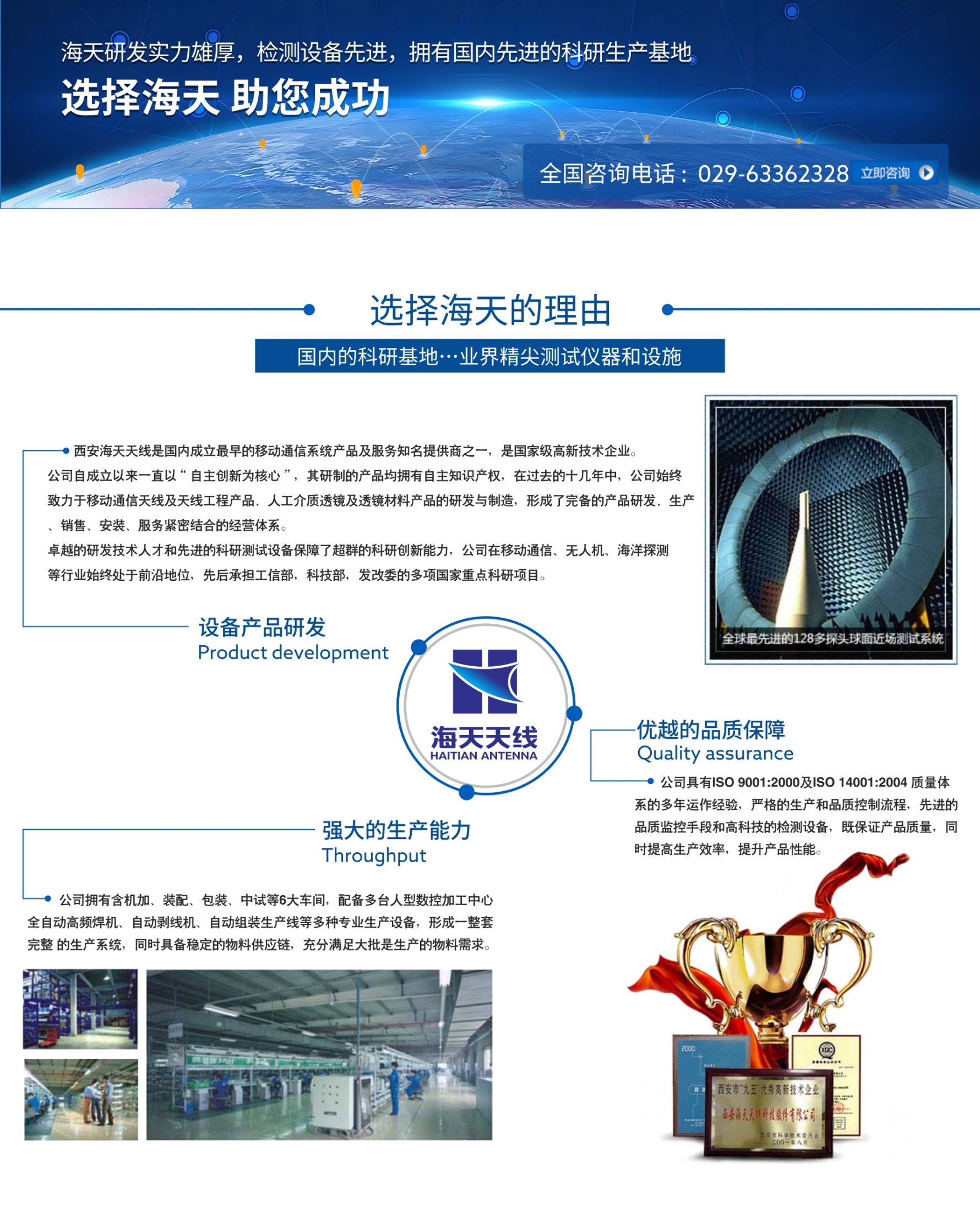 西安海天天線是國內(nèi)成立較早的移動通信系統(tǒng)產(chǎn)品及服務知名提供商之一,高新技術(shù)企業(yè)。公司自成立以來一直以“自主創(chuàng)新為核心”,其研制的產(chǎn)品均擁有自主知識產(chǎn)權(quán),在過去的十幾年中,公司始終致力于移動通信天線及天線工程產(chǎn)品、人工介質(zhì)透鏡天線的研發(fā)與制造,形成了完備的產(chǎn)品研發(fā)、生產(chǎn)、銷售、安裝、服務緊密結(jié)合的經(jīng)營體系。